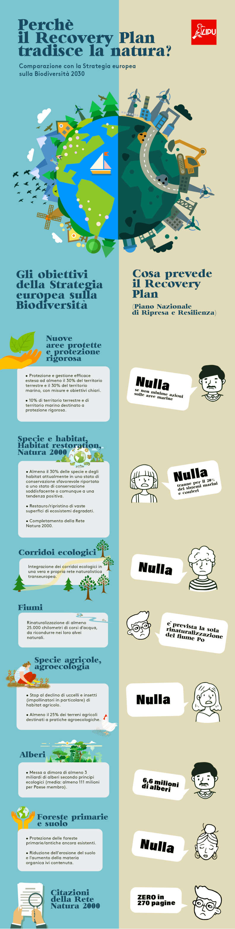L’infografica qui di seguito compara gli interventi previsti dal Recovery Plan con gli obiettivi della Strategia europea per la Biodiversità. Il rapporto è demoralizzante. L’Italia ha cancellato la natura dai suoi programmi. Rete Natura 2000 non esiste. L’estensione delle aree protette non c’è. Il restauro degli habitat è limitato a un solo genere, pur importante, di intervento (sistemi marini e costieri). L’agroecologia è una chimera, sostituita dalla tecnoagricoltura. Corridoi ecologici, ripristino delle specie, riduzione del consumo di suolo: zero.