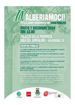 Sempre sul tema degli alberi e del verde nelle città si svolgerà a Prato un ulteriore convegno sabato 7 dicembre alle ore 15, al palazzo della Provincia, dal titolo INalberiamoci! Tutela, cura e incremento del verde pubblico (si veda programma sotto).