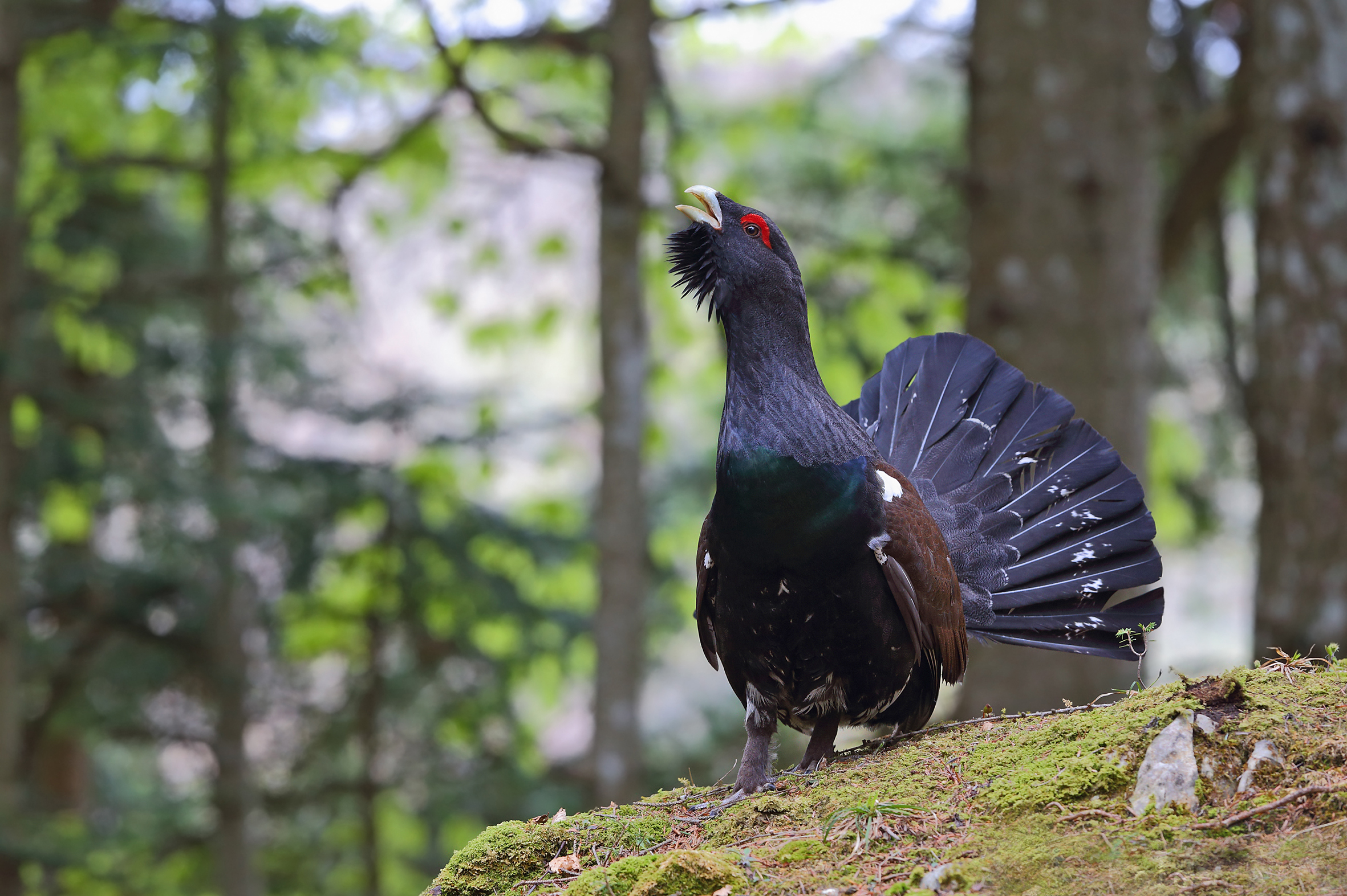 Lungo quasi un metro e pesante fino a 5 kg, il Gallo cedrone è certamente il più grande Galliforme presente sulle nostre Alpi. Inconfondibile nel piumaggio, il maschio si presenta grigio scuro, con abbondanza di sfumature bruno-rossastre sul dorso, mentre la coda è punteggiata da rade macchie bianche. La femmina di dimensioni notevolmente più ridotte, si distingue per il piumaggio marrone-arancio. Specie tendenzialmente poligama e sedentaria, il Gallo cedrone prepara il sito in cui costruire il nido con diversi mesi di anticipo. Già sul finire dell’inverno, quando la neve occupa ancora gran parte dei terreni, i maschi scelgono con cura i siti in cui nidificare, conquistando il territorio ideale – di solito piccole radure o praterie – in cui andare a eseguire la sua particolare parata nuziale. Specie forestale legata alle foreste di conifere disetanee, ben strutturate con piccole radure e ricche di sottobosco. Predilige la fascia altimetrica compresa tra i 1.100 e i 1.500 m, mentre è stata osservata una correlazione evidente tra le caratteristiche climatiche dei siti – anche in termini di piovosità annua – e la scelta da parte dei maschi delle opportune radure in cui effettuare, a primavera, l’attività riproduttiva.